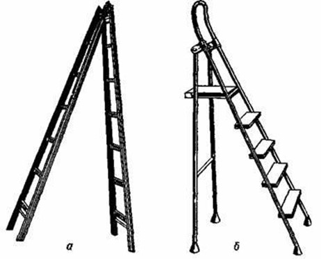 Для роботи у низьких приміщеннях краще застосовувати металеві розсувні драбини, обладнані фіксуючим пристроєм і полицею, які у неробочому стані легко складаються. Укладаючи на них інвентарні щити або дошки, можна робити легкі риштування.