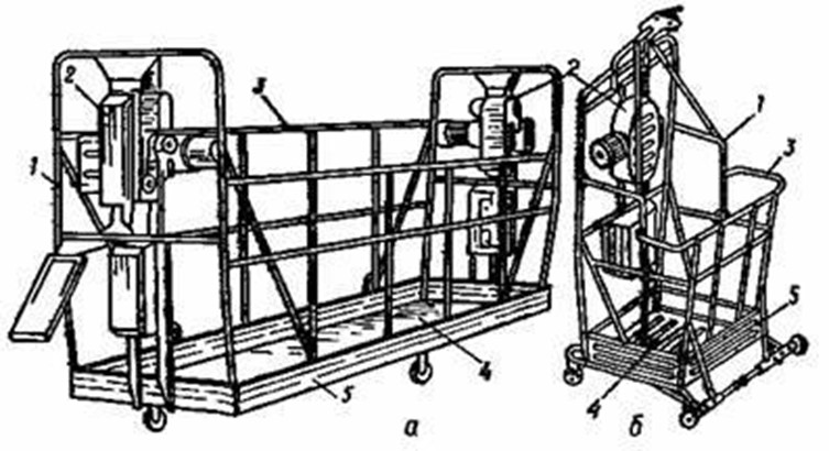 а – самопідіймальна ТП 11, б – самопідіймальна одномісна ЛОС-100-120, 1 – каркас, 2 – електролебідки, 3 – поручні, 4 – настил, 5 – захисний борт