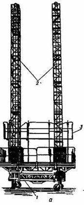 Пересувна, самопідіймальна вишка ВО-10,6-12 (рис. 4, а) складається з двох колон (2), двох візків та робочої платформи (3). Платформа за допомогою лебідки з електроприводом пересувається вздовж колон, як напрямних, з відмітки 1,25 до 10,6 м і може зупинятись на різних висотах у цих межах. Розмір робочої площадки платформи становить 2x4 м. Переміщення платформи здійснюється з пульта управління, що міститься на ній. Якщо електроенергії немає, то платформа пересувається за допомогою ручного привода лебідки, обладнаного поряд з електричним. Вишка спирається на чотири колеса з гумовими ободами.