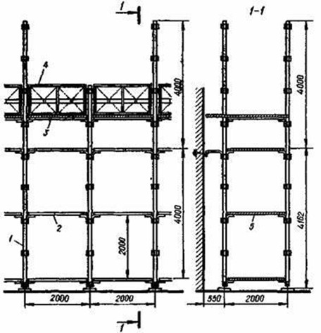 Трубчасті безболтові риштування (рис. 5) застосовують для штукатурення фасадів будинків заввишки до 40 м. Вони складаються з опор, прогонів, поперечок, поручнів та дерев'яного настилу. До кінців прогонів і поперечок приварено гачки, а вздовж опор на відстані 2 м один від одного – спеціальні патрубки. Під час монтажу риштувань гачок прогону вставляють у патрубок опори. Опори встановлюють вздовж стіни на відстані 2 м одна від одної.