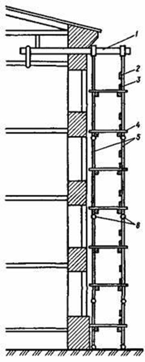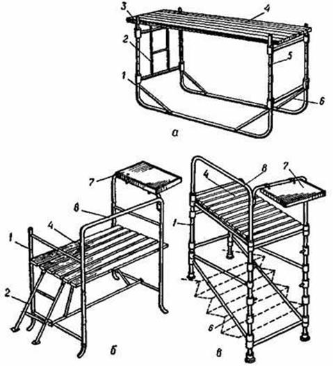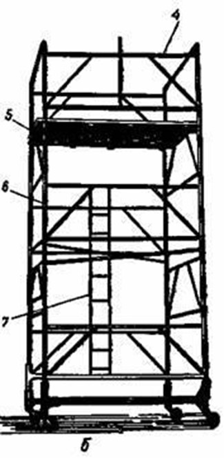 Пересувна збірно-розбірна вишка (рис. 4, б) дає змогу виконувати опоряджувальні роботи на висоті до 6 м. Вона складається з металевого збірного каркаса (6), що спирається на чотири колеса, драбини (7), захисного поручня (4) та дерев'яного настилу (5). На робочому місці вишку збирають із окремих секцій, нарощуючи їх до потрібної висоти. Розмір робочої площадки вишки становить 2х2 м; максимально допустиме навантаження – 200 кг.